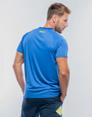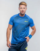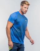 Tricou ranglan cu mâneci scurte și guler rotund, cu design inovator, realizat din material neted și material micro-perforat sublimat în față.